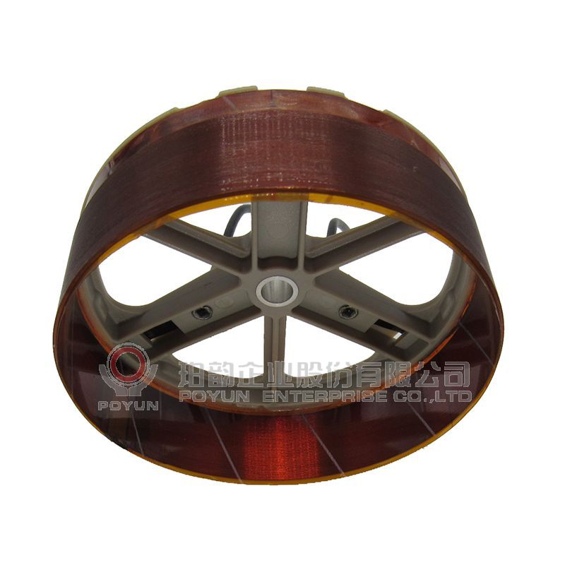扁綫音圈粘合支架,一層立繞,引綫用銅片引出后再接加黑色絕緣套管的錦絲綫。 BOBBIN: Polyimide 綫材:1-ESVR銅扁綫 補强紙:Polyimide